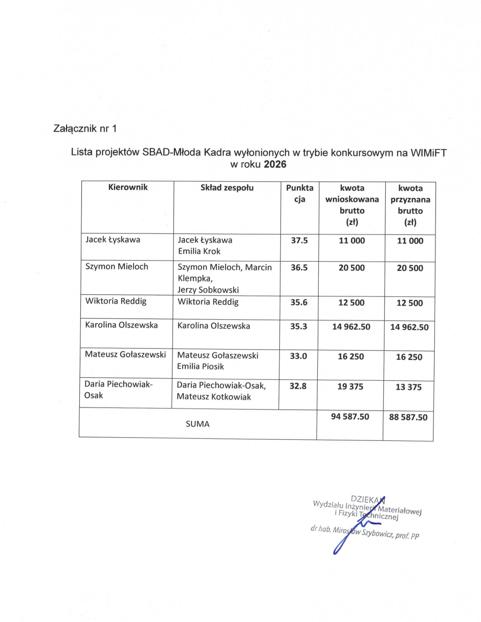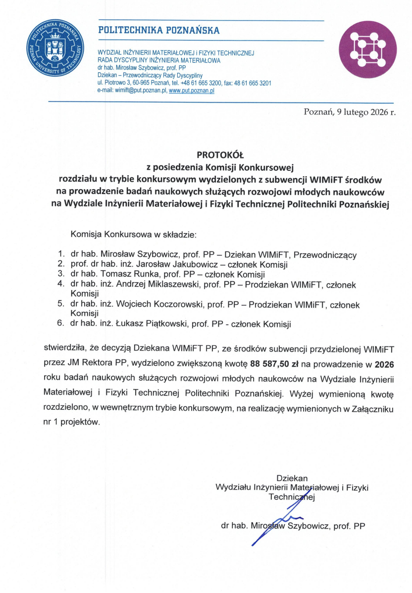 Informujemy, że Dziekan Wydziału Inżynierii Materiałowej i Fizyki Technicznej ogłasza wyniki naboru wniosków o finansowanie projektu w ramach składnika badawczego subwencji Ministra Nauki i Szkolnictwa Wyższego dla uczelni wyższych przeznaczonego na prowadzenie badań naukowych lub prac dyplomowych rozwojowych oraz zadań z nimi związanych, służących rozwojowi młodych naukowców finansowanych w wewnętrznym trybie konkursowym, realizowanych w roku 2026 na Wydziale Inżynierii Materiałowej i Fizyki Technicznej.